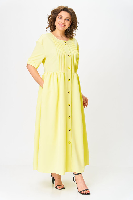 Платье свободного силуэта, длиной макси, выполнено из однотонной ткани. Платье с отрезным лифом и с центральной застежкой на петли и пуговицы. Полочка лифа с нагрудными вытачками и вертикальными защипами, горловина круглой формы с притачной планкой. Спинка с талиевыми вытачками. Пройма углубленной формы. Рукав рубашечного типа, одношовный, длиной до локтя. По низу рукава обработана притачная манжета с эластичной тесьмой. Юбка платья с вертикальными рельефами по передней и задней частям, со сборкой по шву притачивания к лифу. В боковых швах обработаны прорезные карманы