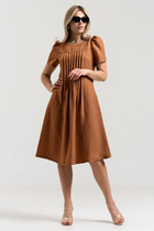 Платье в длине мини, выполнено из шелка. Лиф облегающего силуэта. Юбка притачная, свобоодного силуэта. Застёжка- на потайную молнию в цвет изделия. Лиф и бретели обработаны притачной рюшей из основнойткани.