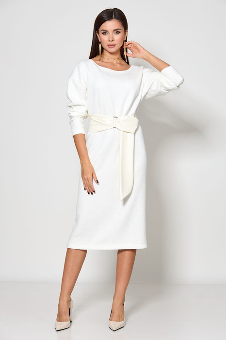 Платье молочного цвета из мягкого и уютного трикотажа , свободного силуэта. Платье с округлым вырезом горловины. Рукав рубашечного покроя с мягкой линией плеча. Длина рукава от точки горловины 68 см , длина платья по среднему шву спинки 105 см. В комплект входит пояс из эко кожи с металлической пряжкой цвета золото.