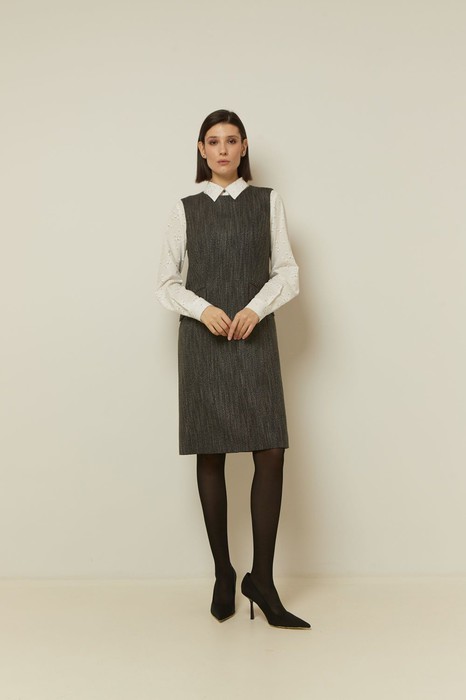 Платье женское на подкладке, полуприлегающего силуэта, длиной ниже колена. На переде карманы «в рамку» с клапаном. В верхней части спинки фиктивная застежка на 7 непрорезных петель и пуговиц, в нижней части спинки шлица. Застежка потайная молния в левом боковом шве.