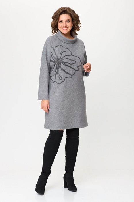 Платье свободного А-образного силуэта, изготовлено из трикотажа. Горловина с воротником-хомут. Рукав спущенный, длинный. Изделие без застежки, декором является вышивка по переду.