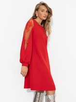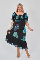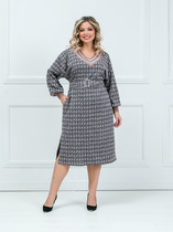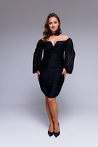 Эффектное женское платье прилегающего силуэта в области талии, выполнено из шифона. Лиф платья отрезной по линии талии, выполнен в стиле корсета. Лиф проклеен дублирином и поставлен на подкладку, также дублированную, что создает плотный лиф и хорошо прилегая к телу, скрывает недостатки фигуры, утягивая ее. Лиф платья имеет несколько рельефов, которые декорированы кантом со стразами. Юбка платья имеет расклешенный силуэт, спинка идентична полочке, со средним швом, в боковом шве потайная молния. Также на платье обработан рукав расклешенного силуэта, из основной ткани. Эффектное, роскошное платье для обладательниц роскошных форм!