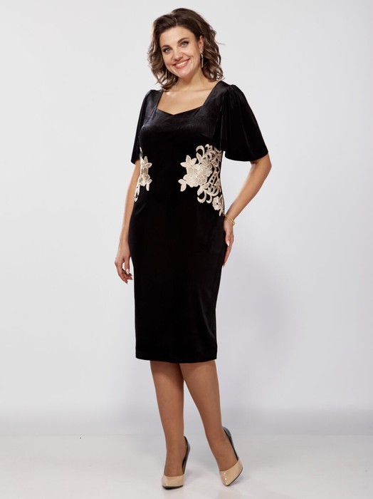 Элегантное женское платье, полу-прилегающего силуэта, выполнено из велюра, в качестве отделки кружево. Вырез горловины фигурной формы, на обтачке, также на полочке обработаны нагрудные вытачки, по бокам аппликация из кружева. Спинка из велюра, со средним швом и рельефами, рукав втачной, со сборкой по окату. Эффектное платье прекрасный выбор для любого мероприятия, а кружево по талии отлично подчеркнет силуэт и сделает его визуально стройнее.