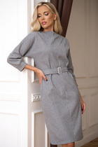 Платье на подкладке свободного силуэта с V-образным вырезом горловины. По переду мягкая складка декорированная металлическим пришивным элементом. Рукав втачной одношовный с резинкой по низу. Изделие дополнено съемным ремнем. Длина платья по спинке-108 см. Длина рукава 48 см.