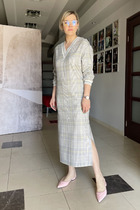 Нарядное платье, выполненное из плательной ткани с легким блеском (тянется). По переду ассиметричный отрезной пояс с отделочным кантом. Верхняя часть переда с рельефными швами. По нижней части переда – баска, переходящая в волан. Спинка со средним швом, талиевыми вытачками и бантовой складкой по нижней части. Застежка на потайную тесьму-молнию в среднем шве спинки. Горловина округлой формы. Рукава втачные, одношовные с разрезами по низу.