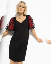 Нарядное праздничное платье с отрезным низом выполнено в сочетании 2-х видов ткани. Верх платья выполнен из кружевного полотна с паеткой. Перед целый, с двумя нагрудными вытачками. Спинка со средним швом. Овальный вырез горловины переда и спинки обработан подкладом. Рукав втачной длинный, слегка зауженный к низу. Длина рукава в 48 р-ре – 56 см. в 64 р-ре – 60 см., ширина рукава по низу в 48 р-ре – 22 см. в 64 р-ре – 26 см. Низ платья со сборкой по шву притачивания, выполнен из ткани-компаньона. Платье без застежек на подкладе. Подклад выполнен из креп-шифона. Длина изделия по спинке в 48 р-ре –  95 см. в 64 р-ре – 104 см.