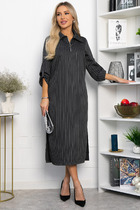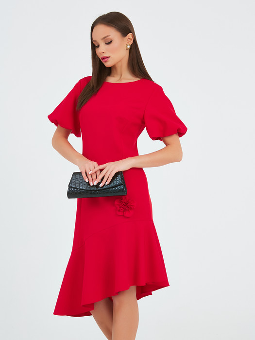 Перед с рельефами. В среднем шве спинки потайная застёжка молния. Ассиметричный низ платья обработан воланом. Платье декорировано цветком.