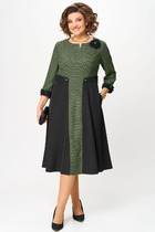 Элегантное платье прилегающего силуэта отрезное по линии талии, выполнено из костюмно-плательной ткани. V-образный вырез горловины с имитацией запаха, с углубленным воротником шалевого типа, прикрывающий руки. По краю воротника и в вертикальном подрезе юбки обработана отделочная деталь контрастного цвета. Спинка со средним швом, переходящим в шлицу.