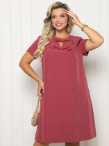 Платье женское относится к нарядной торжественной одежде, но может использовано и при повседневной носке. Платье женское, отрезное по линии талии, расширенное к низу, длиной за колено. Верхняя часть переда с отрезными рельефами, выходящими из плечевых швов, центральная часть с зафиксированным запахом. Верхняя часть спинки со средним швом и 2-мя рельефами, выходящими из плечевых швов. Горловина с V-образным вырезом, фигурная, обточная без воротника. Нижняя часть переда и нижняя часть спинки цельнокроеные, выполнены из отделочной ткани. Шов соединения верхней и нижней частей платья декорирован притачной фигурной отлетной баской. Платье с декоративным поясом из отделочной ткани, закреплённом на левом боковом шве и фиксирующимся в бант через металлическую пробивную блочку на центральной части переда. Рукав одно шовный втачной, длиной до локтя, с притачной фигурной манжетой. Платье с плечевыми накладками. Нижняя часть на подкладке. Длина платья 112 см, длина рукава 33 см.