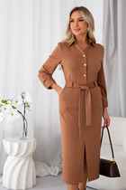 Трехъярусное платье из легкой струящейся ткани A-силуэта длиной миди. Рукав втачной, длиной 5/6, с фигурными отверстиями сбоку и с манжетой переходящей в бант. Вырез горловины v-образный. Платье на подкладке.
