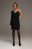 Нарядное платье трапециевидного силуэта с рукавом реглан. Рукав прямой, низ на резинке. Низ платья оформлен рюшей из плиссированной ткани. Вырез горловины круглый с заложенными вокруг нее складками, декорирован завязывающимся бантом и пришивными стразами. Платье выполнено на подкладке.