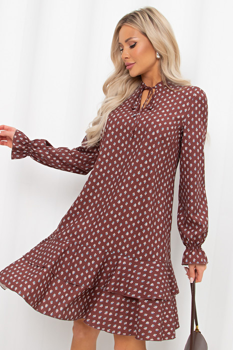 Романтичное платье А силуэта выполнено из легкой ткани Ниагара. V - образная горловина оформлена стойкой с завязками. Длинный втачной рукав присборен на эластичную резинку. Низ платья оформлен притачным воланом.