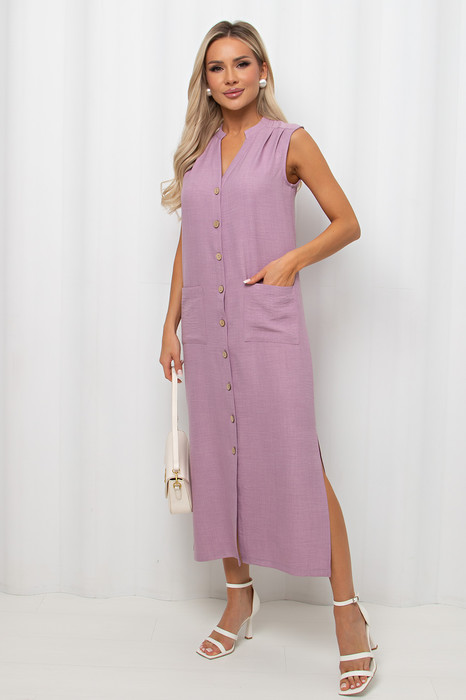 Комфортное летнее платье прямого кроя. Горловина оформлена стойкой. V - образный вырез переходящий в планку с застежкой на петли и пуговицы. Перед дополнен накладными карманами. Низ ровный, по бокам разрезы.