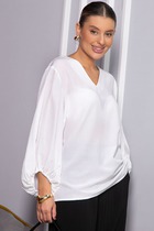Блузка женская классическая прямого силуэта. Перед с вертикальными декоративными бейками, с застёжкой на петли и пуговицы. Рукав втачной одношовный со сборкой по низу, на притачном манжете. Воротник рубашечный на стойке.
