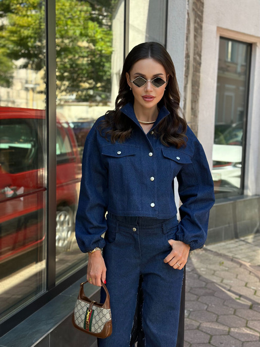 Рубашка из плотого денима, ворот высокий, застёжка на пуговицы. Пойкрой свободный. По передним половинкам обработаны клапаны