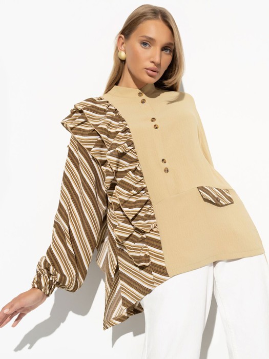 В письме от тайного поклонника, сообщалось, что помимо невероятных личностных качеств, его сводит с ума твое умение одеваться. Ты читала это в умопомрачительной рубашке, которая в общем-то заслуживает отдельного письма с комплиментами. Рубашка свободного кроя. Воротник-стойка. Имитация кармана. Объемный многослойный декор с одной стороны изделия. Деликатные разрезы по бокам.