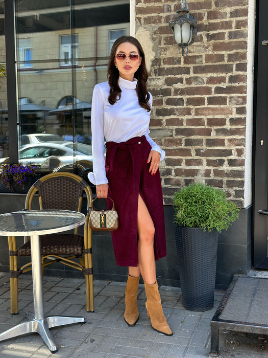 Юбка на запах, в длине миди, выполнена из неэластичной ткани. Застёжка на пуговицы (потайная и декоративная), обработаны шлёвки на поясе; в комплект входит пояс из основной ткани