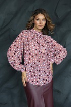 Блузка застегивается на пуговицы по цельнокроеной планке и завершается воротником на стойке. Рукава являются втачными и заканчиваются манжетами с застежкой на пуговицу, что позволяет регулировать их ширину с помощью специальной паты. Эта модель станет универсальным элементом гардероба, подходящим для повседневной носки, учебы или соблюдения дресс-кода.