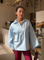 Эта модель — идеальное воплощение парижского шика, где каждая деталь подчеркивает утонченность и женственность. Свободный крой и накладные карманы создают классический образ. Также отличительной особенностью рубашки являются клешеные рукава со кошенным краем. Нежный голубой цвет придает легкость образу.