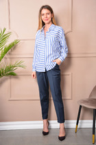 Рубашка женская полуприлегающего силуэта выполнена из летней струящейся ткани с добавлением эластана, с втачными карманами по груди, отстроченными по контуру контрастными нитками с листочкой и пуговицей. Горловина круглая с притачной планкой, застежка спереди на петли пуговицы. Рукав втачной короткий с отрезным манжетом, отстроченным контрастными нитками, в боковых швах снизу разрезы. Длина изделия- 80 см, рукава- 30 см.