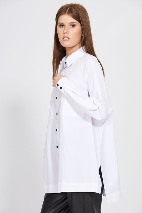 Блузка выполнена из плательно-блузочной ткани. Блузка прямого силуэта, покроя оверсайз, длиной ниже линии бедер. Спереди накладные нагрудные карманы и центральная застежка на пуговицы. Спинка цельная, длиннее переда. Воротник стояче-отложной. Плечевой шов спущен. Рукав рубашечного покроя, одношовный, с прорезью и двумя складками по низу. Низ рукава на притачной манжете. В боковых швах разрезы.