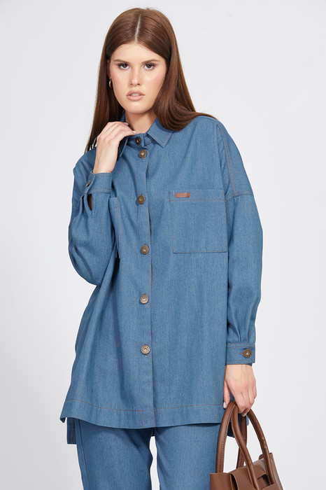 Блузка выполнена из джинса. Блузка прямого силуэта, покроя оверсайз, длиной ниже линии бедер. Спереди накладные нагрудные карманы и центральная застежка на металлические пуговицы. Спинка цельная, длиннее переда. Воротник стояче-отложной. Плечевой шов спущен. Рукав рубашечного покроя, одношовный, с прорезью и двумя складками по низу. Низ рукава на притачной манжете. В боковых швах разрезы. Блузка декорирована нашивкой на кармане.