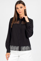 Блузка выполнена из блузочной ткани в полоску. Блузка прямого силуэта, длиной ниже линии бедер. Спереди центральная застежка на пуговицы. Спинка цельная. Вортник стояче-отложной с отрезной стойкой. Плечевой шов удлинен. Рукав рубашечный, одношовный. Низ рукава на широкой манжете. В боковых швах разрезы. Низ блузки фигурной формы.