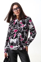 Блузка женская свободного силуэта из блузочной ткани. Воротник стояче-отложной, застежка на петли и пуговицы. На спинке кокетка и складка. Плечо спущенное, рукав длинный со складками, внизу высокий манжет с застежкой на петли и пуговицы. Блузка с фигурной линией низа. Декор — вышивка-аппликация из органзы.