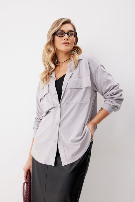 Блузка женская прямого силуэта из замшевой ткани длиной за линию бедер. По переду блузки отрезные кокетки и нагрудные накладные карманы с клапаном, застегивающиеся на кнопку. Спинка с отрезной кокеткой и встречной складкой. Линия плеча спущена. Рукав рубашечный втачной по низу с 2 –мя складками и отрезной манжетой, застегивающейся на кнопку. Воротник втачной рубашечный. Линия низа имеет фигурную форму. Воротник, кокетки, карманы, линия проймы отстрочены отделочными строчками. Застежка на кнопки центральная.