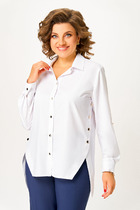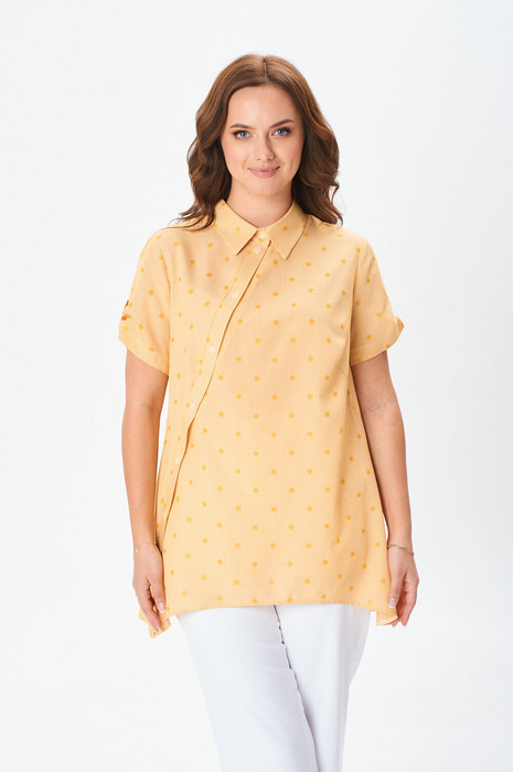 Стильная рубашка свободного кроя с ассиметричной центральной планкой на застежку петли-пуговицы. Рукав короткий. Спинка изделия с кокеткой и складкой. Низ изделия фигурный.