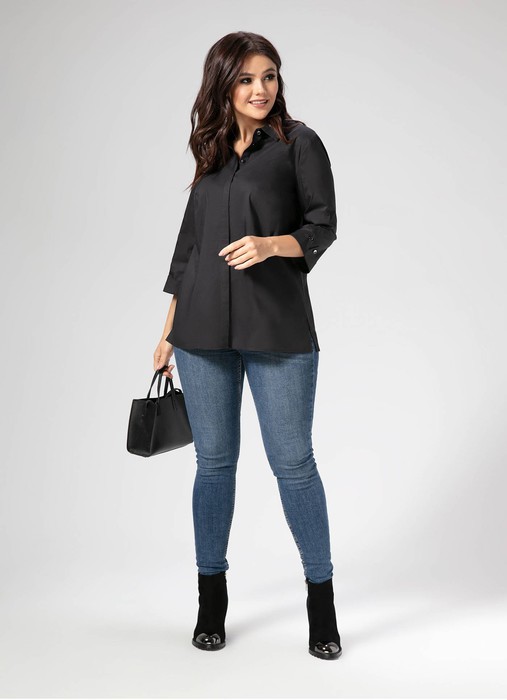 Лаконичная и строгая блузка из хлопковой ткани – отличный вариант для офиса. Блузка полуприлегающего силуэта слегка расширенная к низу, по бокам имеются небольшие разрезы. Блузка с центральной сквозной застежкой на потайные петли и пуговицы и одну декоративную пуговицу на стойке воротника. По переду имеются нагрудные выточки, по спинке имеется кокетка, от кокетки - небольшая сборка, что обеспечивает особый комфорт. Рукава длиной чуть ниже локтя, с отложными манжетами. На манжетах имеются декоративные петли и пуговицы. Такая блузка отлично сочетается с различными брюками, джинсами, сарафанами, создавая стильный современный образ.
