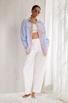Блузка полуприлегающего силуэта. Застёжка по переду потайная на петли и пуговицы. По планке переда - вышивка. Воротник рубашечный. Рукав прямой на манжете. Манжета с застёжкой на петлю и пуговицу.