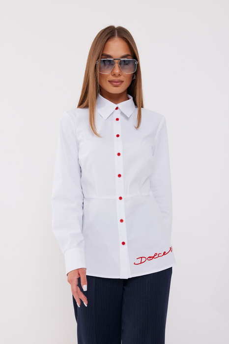 Блузка полуприлегающего силуэта, отрезная линия талии. Застёжка по переду на петли и пуговицы. Воротник рубашечный. На левой полочке по низу - вышивка. Рукав прямой с манжетой. Манжета с застёжкой на петлю и пуговицу.
