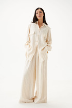 Рубашка— не просто верх, а главный акцент. Кожа, плотная, но податливая, образует «оверсайз» силуэт. Плечо, от места втачивания воротника и до вытачки по рукаву, украшены декоративными косичками из кожаных тесёмок. По переду рубашки застёжка на декоративные пуговицы в тон ткани по планке, и накладные карманы. Воротник рубашечного типа. Линия плеча спущенная. Спинка в рубашке с отрезной кокеткой. Рукав втачной, длинный с локтевым швом и разрезом от низа; заложенной складкой от низа и притачной манжетой. Низ в рубашке ассиметричный. Длина рубашки по спинке 81 см. Длина рукава рубашки 52 см.
