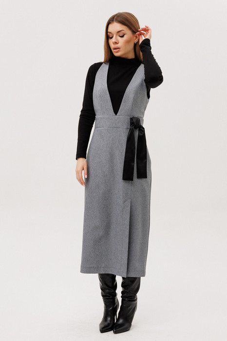 Сарафан женский прилегающегосилуэта с V-образным вырезом, вытачками на лифе. На притачном поясе декоративный элемент (БАНТ) ИЗ АТЛАСНОЙ ЧЕРНОЙ ТКАНИ. По переду разрез. На спинке сарафана молния. Длина миди. Изделие на подкладке