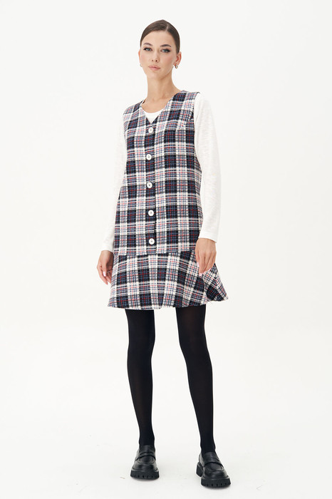 Сарафан свободного А-силуэта с центральной застёжкой и притачным воланом по низу. Полочка с нагрудной вытачкой. Спинка с центральным швом, плечевой и талиевой вытачкой. Длина сарафана около 92 см