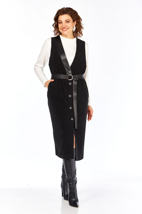 Сарафан прямого силуэта из трикотажного полотна с имитацией вельвета. Горловина V -образной формы с отделкой из экокожи. Застежка центрально — бортовая на петли и пуговицы. По переду нагрудные вытачки и обработаны карманы с листочками. На спинке фигурный вырез. Сарафан на подкладке. Длина сарафана по спинке — 118 см.