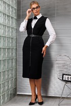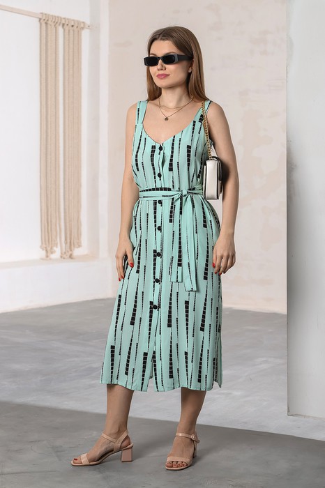 Сарафан женский из тканого штапельного полотна с набивным рисунком, удлиненный, слегка расширенный книзу, с широкими бретелями, глубоким вырезом горловины, центральной бортовой застежкой на обметанные петли и пуговицы, карманами и разрезами в боковых швах. На полочках - вытачки в области груди. Изделие укомплектовано съемным поясом, завязывающимся вокруг талии.