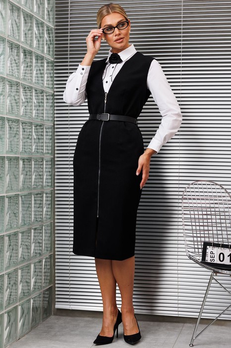 Сарафан полуприлегающего силуэта отрезной по линии талии и талиевыми вытачками. Спинка со средним швом и талиевыми вытачками. Застежка на тесьму молнию. Дополнением является съемный пояс, что позволяет регулировать ширину по линии тали.