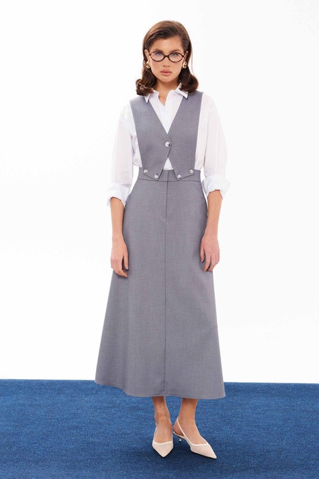 Сарафан женский из смесовой ткани для повседневной носки. Сарафан со съемным верхом. Жилет имеет центральную бортовую застежку на одну обметанную петлю и одну пуговицу. Жилет крепиться на пояс юбки с застежкой на обметанные петли и пуговицы. Юбка чуть расширена к низу. Верхний срез юбки обработан притачным поясом с застежкой на крючок, а также в среднем шве имеется застежка на тесьму-молнию. Заднее полотнище юбки имеет две талиевые вытачки. В боковых швах имеются потайные прорезные карманы. Данный сарафан очень многофункциональный, вы можете носить отдельно юбку и собирать стильные образы. Сарафан будет удобный и практичный в носке, а большое содержание вискозы подарит комфорт.