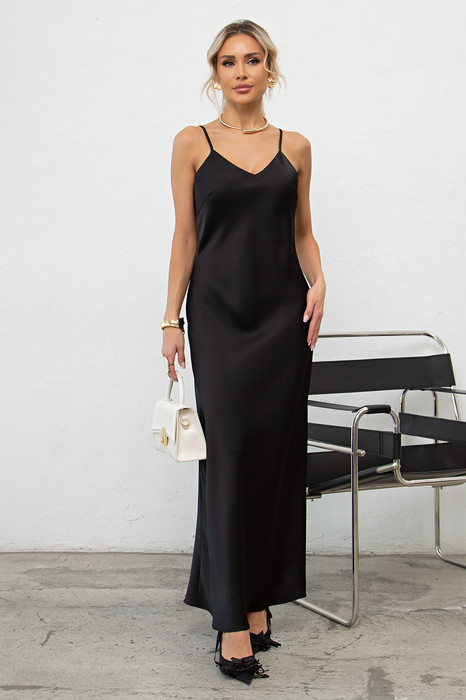 Элегантное длинное платье полуприлегающего силуэта. V-образная горловина по переду и спинке на внутренней обтачке. Тонкие брители с регулируемой высотой.