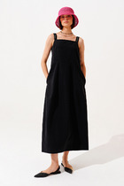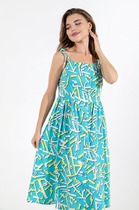 Сарафан молодежный из трикотажного полотна «кулирка» с набивным рисунком в полоску, полуприталенного силуэта на тонких бретелях, с карманами в боковых швах. Вырез горловины полочки и спинки обработаны притачной планкой из основного материала, проймы окантованы.