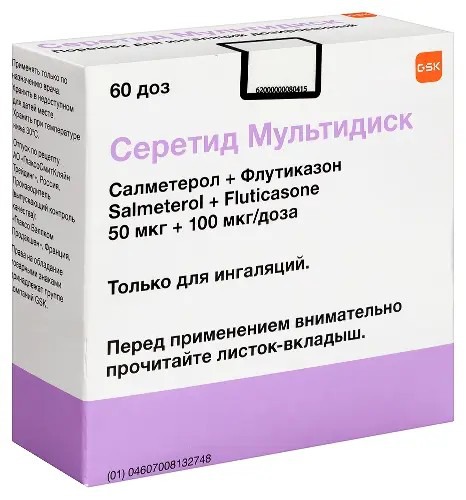 Розничная цена от 1240. Препарат Серетид® Мультидиск предназначен для регулярного лечения бронхиальной астмы, если показана комбинированная терапия бета2-адреномиметиком длительного действия и ингаляционным кортикостероидом: