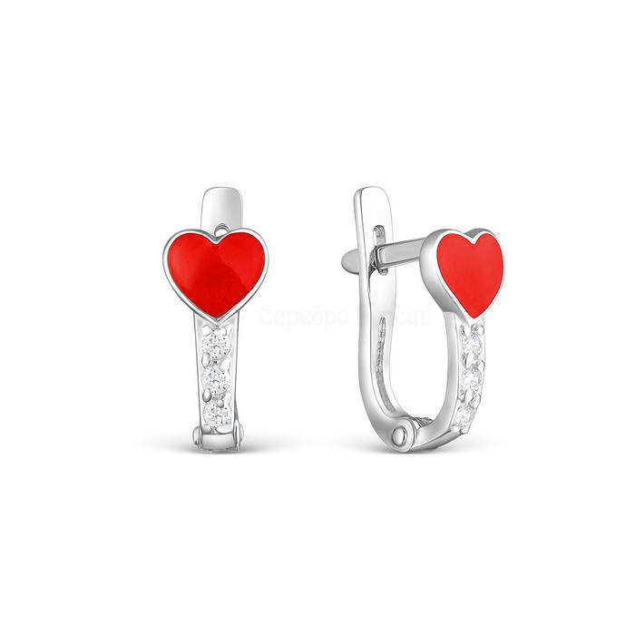 Серьги детские из серебра с эмалью и фианитами родированные - Сердечки 925 пробы