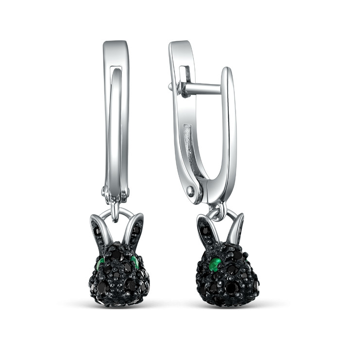 Серьги из серебра с зелёным агатом и чёрной шпинелью родированные - Кролики 925