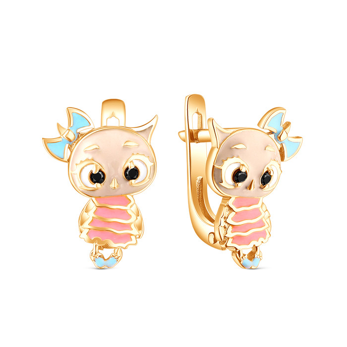 Серьги из золочёного серебра с эмалью и фианитами - Совы 925 пробы ДС-07з