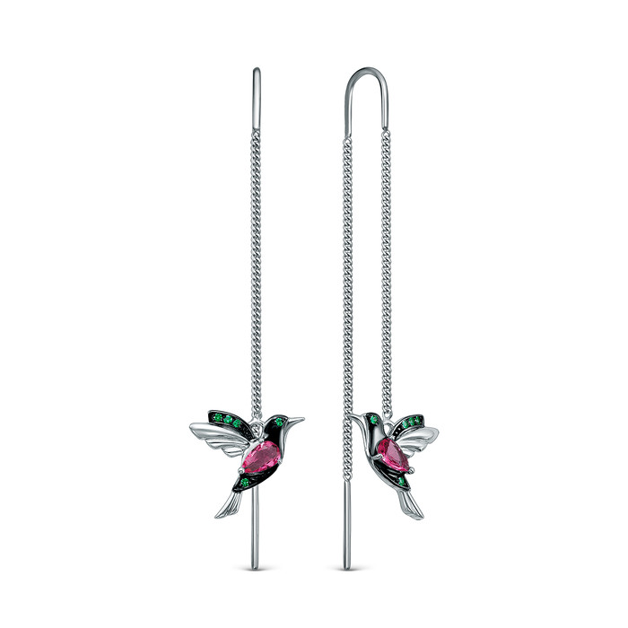 Серьги-продёвки из серебра с плавленым кварцем цвета родолит и фианитами родиров