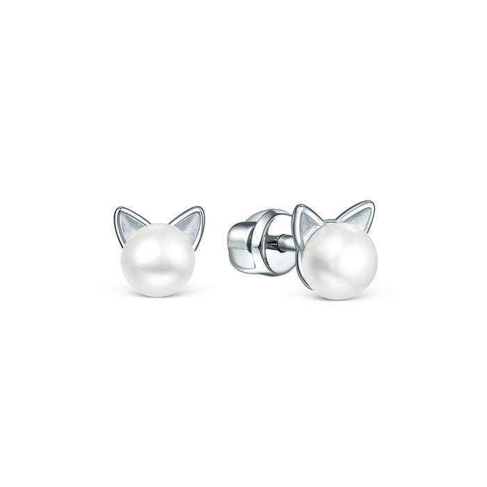 Совместные покупки Каменск-Уральский Ювелирные украшения и бижутерия Серьги — Серьги-пусеты из серебра с культивированным жемчугом родированные - Кошки 925 пр