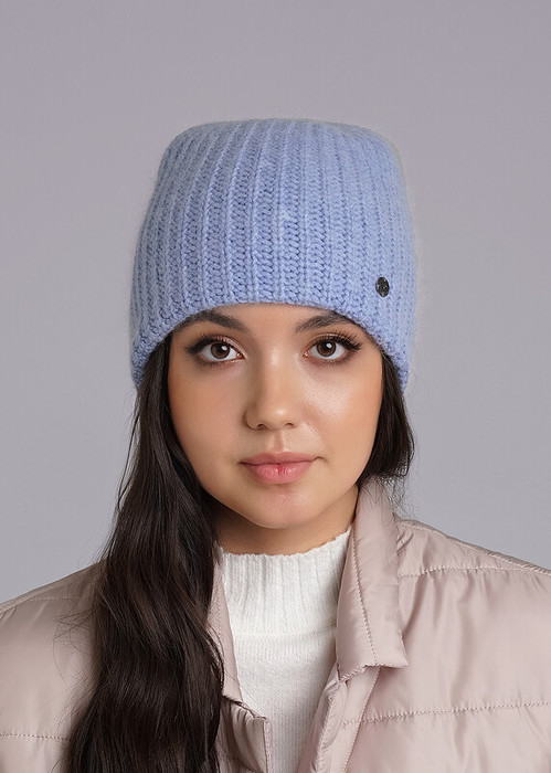 Женская элегантная шапка, без отворота, с завышенной высотой макушки. Шапка двойная, верхний слой выполнен из ангоросодержащей пряжи, внутренний слой из гипоаллергенной пряжи. Декорирована стильной нашивкой логотип.