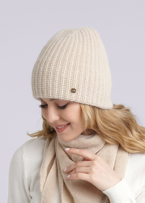 Женская элегантная шапка, без отворота, с завышенной высотой макушки. Шапка двойная, верхний слой выполнен из ангоросодержащей пряжи, внутренний слой из гипоаллергенной пряжи. Декорирована стильной нашивкой логотип.